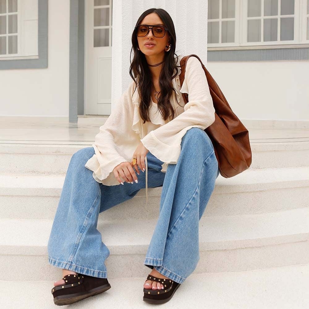 Blusa Feminina Manga Longa Com Babados Patricia Foster Bege